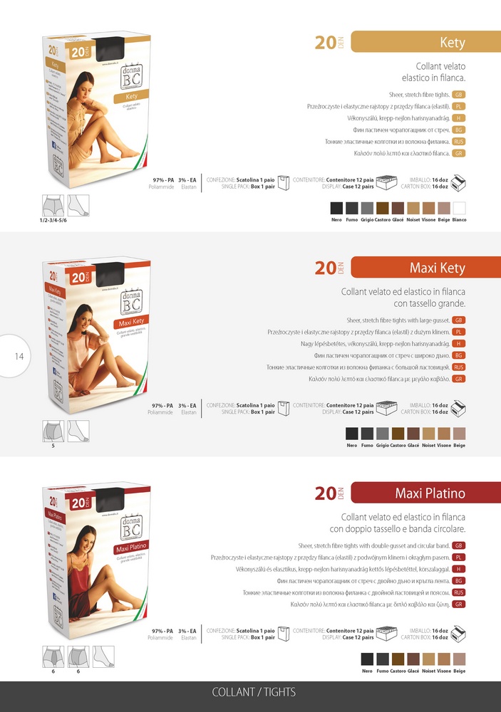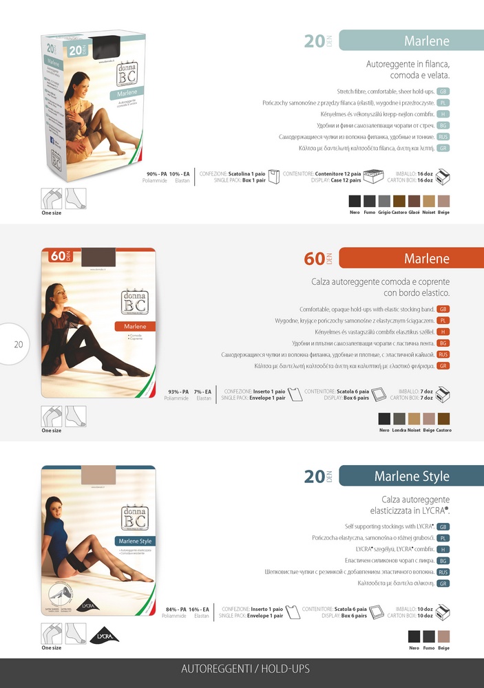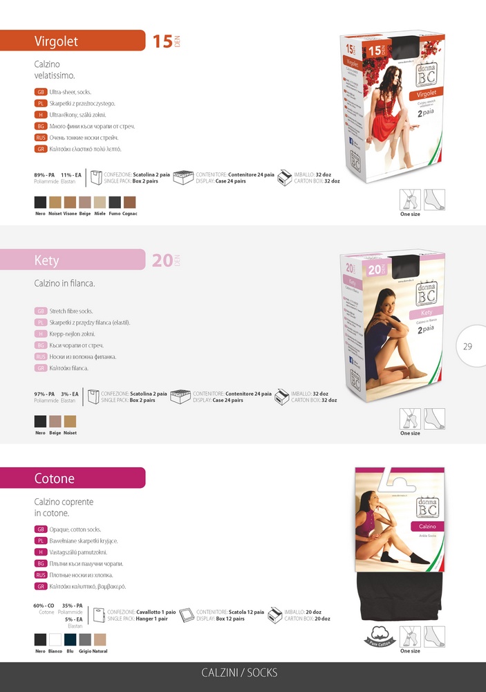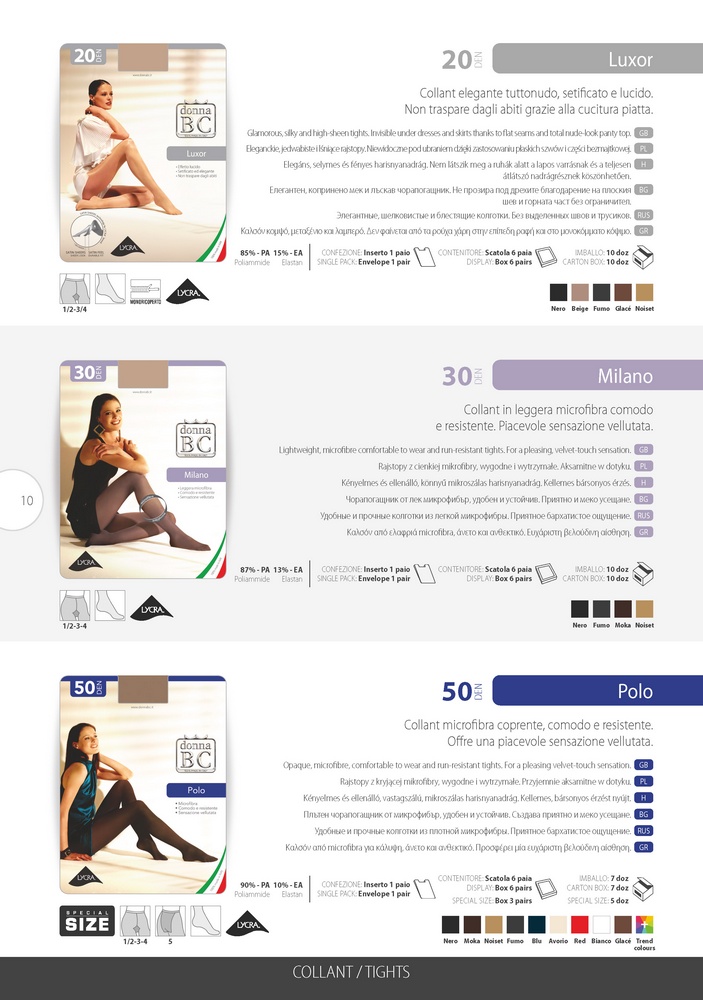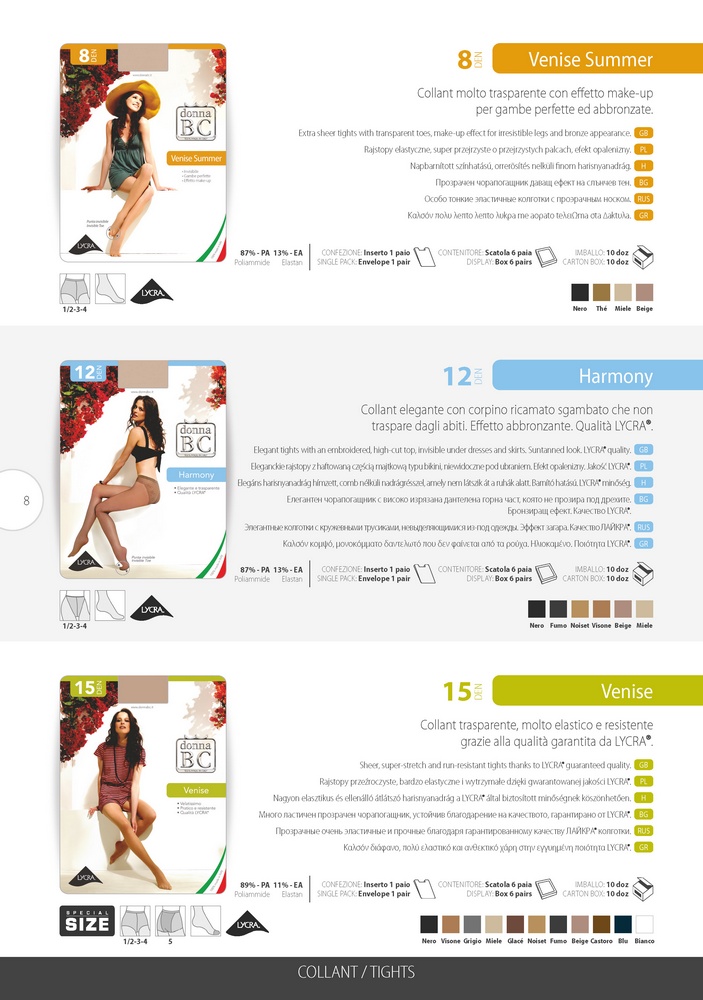 Tonalità calde e suggestive, giochi di luce seducenti, atmosfere mediterranee: in Donna BC, tutto evoca lo stile e l’eleganza italiana. Da più di 60 anni, infatti, le calze e i collant Donna BC interpretano le mille sfaccettature della femminilità attraverso filati pregiati e lavorazioni ricercate, per prodotti dalla qualità 100% made in Italy.