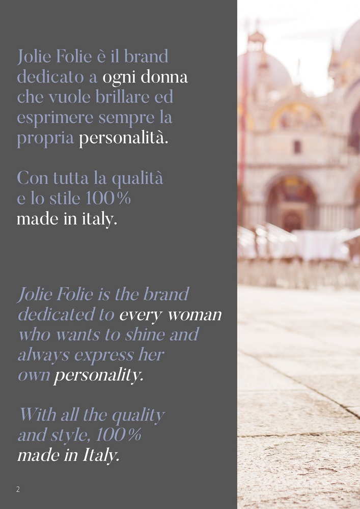 L’indiscussa qualità di ogni singolo capo è il segreto dell’intera collezione: in Jolie Folie la donna e il suo benessere sono sempre al primo posto.