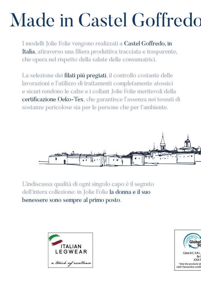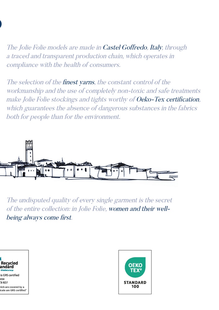 La selezione dei filati, il controllo costante delle lavorazioni e l’utilizzo di trattamenti completamente atossici e sicuri rendono le calze e i collant Jolie Folie meritevoli della certificazione Oeko-Tex, che garantisce l’assenza nei tessuti di sostanze pericolose sia per le persone che per l’ambiente.